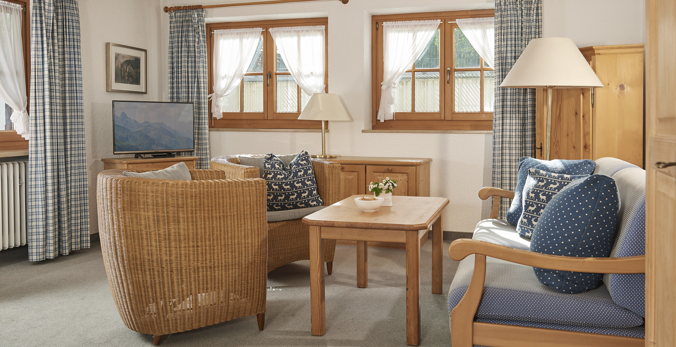 In der freundlichen weißen Küche gibt es einen kleinen Esstisch aus Ratanmöbeln, genau der richtige Platz für einen Kaffee. Das separate Wohn- und Esszimmer mit Sitzgelegenheit und TV-Ecke ist hell und großzügig geschnitten. Auch das Schlafzimmer des Illerstübles ist in einem extra Raum untergebracht, mit 2-Meter- Doppelbett und großzügiger Schrankwand.