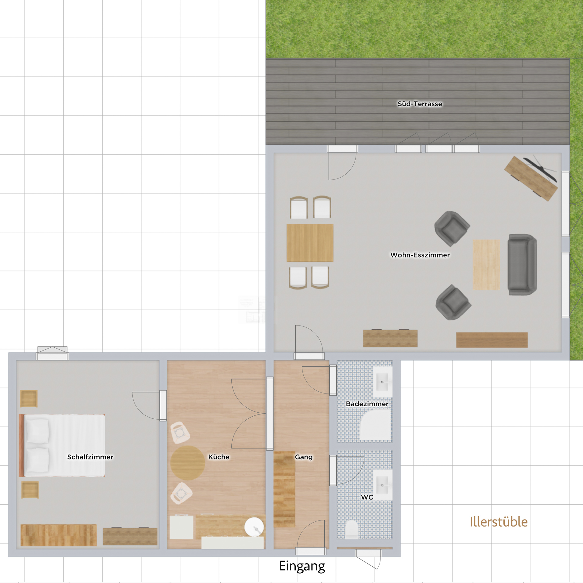 Diese Wohnung ist wie ein kleines Haus im Haus. Sie besitzt einen eigenen Eingang, der direkt über den Parkplatz erreichbar ist und wirkt vollkommen abgetrennt vom Rest des Anwesens. Das ILLERSTÜBLE verfügt über eine große, vollkommen begrünte und sehr hübsche Terrasse mit Bergblick und einen eigenen Garten!