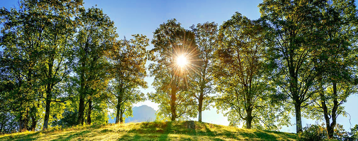 Oben angekommen, empfängt Sie eine herrlich friedliche Atmosphäre unter alten Bäumen und ein fantastischer Blick auf den gesamten Bergkessel und die Schattenberg Skiflug Schanzen. Es gibt zahlreiche Bänke und einige Sonnenliegen, Zeit zu Verweilen und die Eindrücke zu genießen!