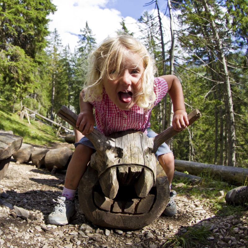 Nach der „hinteren Seealpe“ kehren wir nun auf der anderen Seite des Tales zurück Richtung Station Seealpe. Ein „Hochstand“ von dem aus es vieles zu entdecken gibt oder eine „Märchen- und Sagenstation“ – tief im dunklen Dickicht, sorgen weiterhin für Kurzweil und leuchtende Kinderaugen.