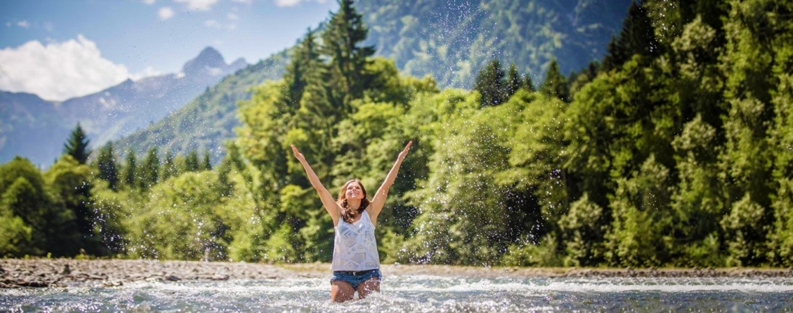Begeben Sie sich auf einen wunderschönen Blumen-, Wald-, und Wiesenspaziergang über den Ösch und zum Beispiel weiter an der Stillach entlang. Das tosende Wasser wirkt herrlich beruhigend und viele Kiesbänke mit kleinen Pumpen laden zum Verweilen und Spielen ein. Auch mit dem Kinderwagen oder dem Rad sind die breiten und fast ebene Weg sehr gut befahrbar.