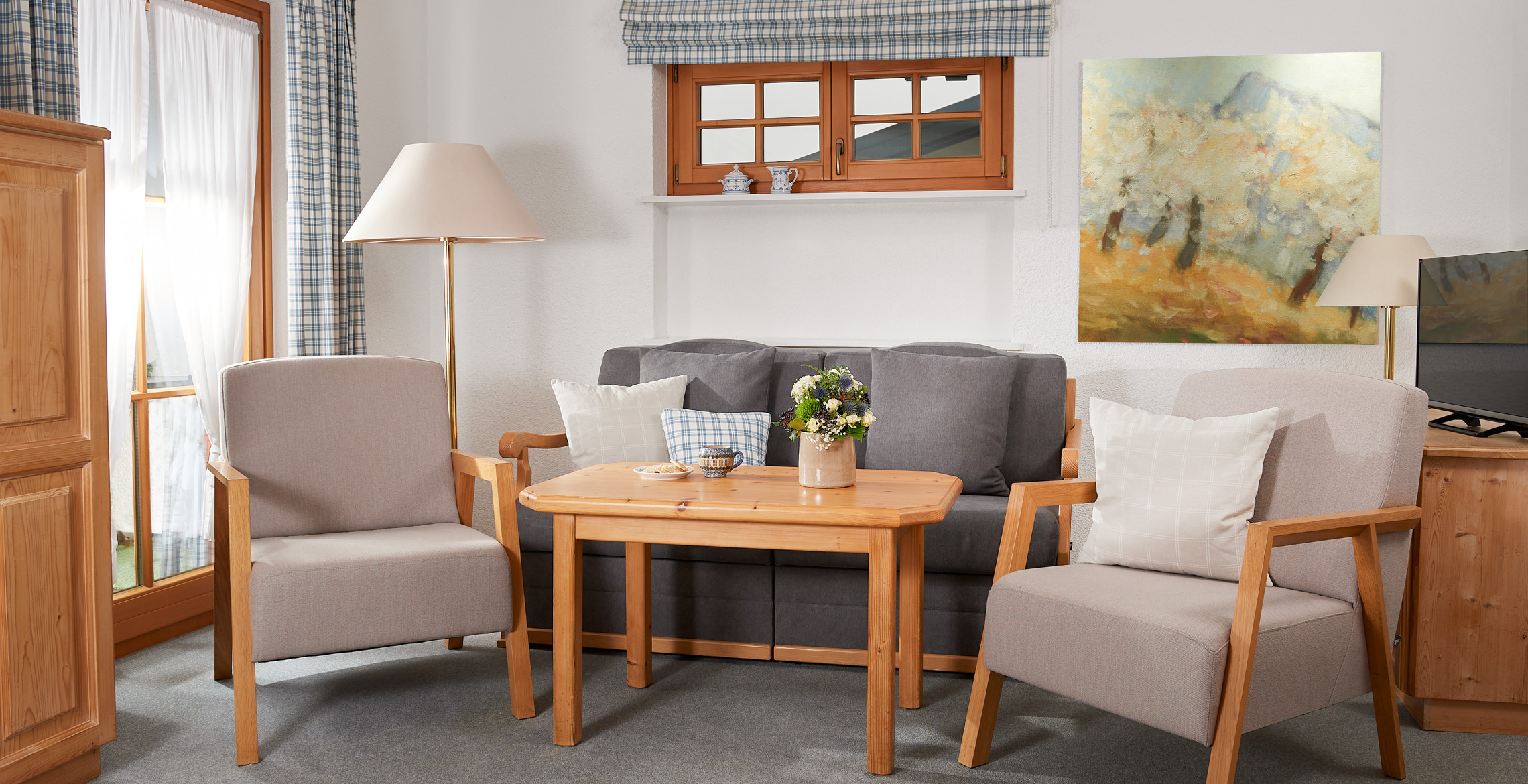 Unsere Landhaus-Ferienwohnung STILLACHSTÜBLE ist ein ganz besonderer Liebling bei Paaren, die sich Platz wünschen und Familien. Echtes Altholz-Täfer ziert den Wohnraum und eine Sitzgruppe mit hochwertigem Leinensofa und passenden Sesseln laden zum Verweilen ein. Hier im kombinierten Wohnraum finden Freizeit, Essen und Kochen in einem Raum statt. ... Zeit für Gespräche, lachen, lesen, faulenzen- Urlaubsgenuss!